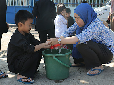 Kali ini kami memilih untuk mengajarkan bagai mana cara mencuci baju sendiri. Belajar menguasai kemampuan tertentu membutuhkan berbagai kesempatan bagi anak untuk mempraktekkan kemampuan tersebut dengan dukungan dan bimbingan. Orangtua dan pendidik memberikan atmosfer yang kondusif, sehingga anak dapat bebas mengekspresikan pemikiran kritis dan sesuatu yang dipikirkan ataupun dirasakan. Komunikasi terbuka dan diskusi tentang isu-isu tertentu akkan membuka wawasan dan perilaku yang lebih bijak dalam menghadapi sesuatu. Melalui pembiasaan, perilaku adaptif akan muncul spontan ketika anak menemukan kejadian sesuatu yang harus dihadapi.