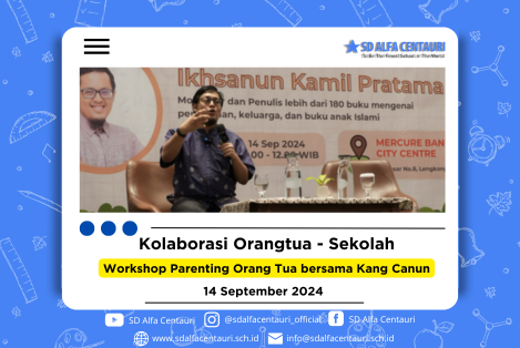 Alhamdulillah workshop parenting bertajuk "Mendampingi Anak di Dunia Digital" telah terselenggara dengan baik, kegiatan yang berlangsung di Hotel Mercure Lengkong Bandung ini Alhamdulidihad di hadiri oleh kurang lebih 150 orang tua siswa. Workshop ini menghadirkan Kang Ihsanul Kamil atau akrab disapa Kang Canun. Dalam seminar ini, Kang Canun menyampaikan tentang :