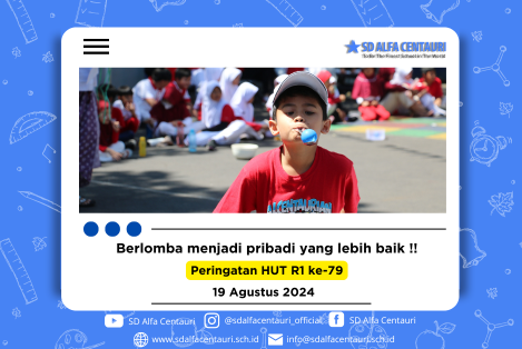 Alcentaurian ambil bagian dalam memeriahkan kegiatan peringatan 17 Agustus, SD Alfa Centauri mengadakan kegiatan lomba yang dapat melatih dan mengingatkan pada nilai-nilai perjuangan para pahlawan. Acara ini hanya bagian kecil dari bukti perjuangan kami, karena perjuangan sesungguhnya adalah saat kami dapat melawan diri kami dari hal-hal yang tidak baik. Merdeka Indonesia Kuu !!