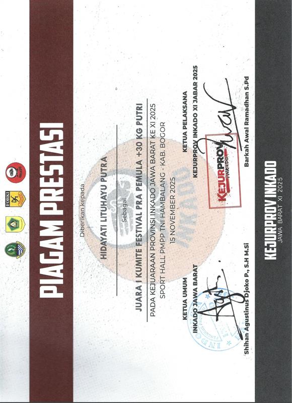 Pada tanggal 15 November 2025 Ananda Hidayati Lituhayu Putra telah mengikuti lomba KEJURPROV INKADO yang diselenggarakan oleh INKADO Jawa BArat ditingkat Provinsi . Alhamdulillah Ananda meraih juara 1 Pra Pemula +30 KG Putri.