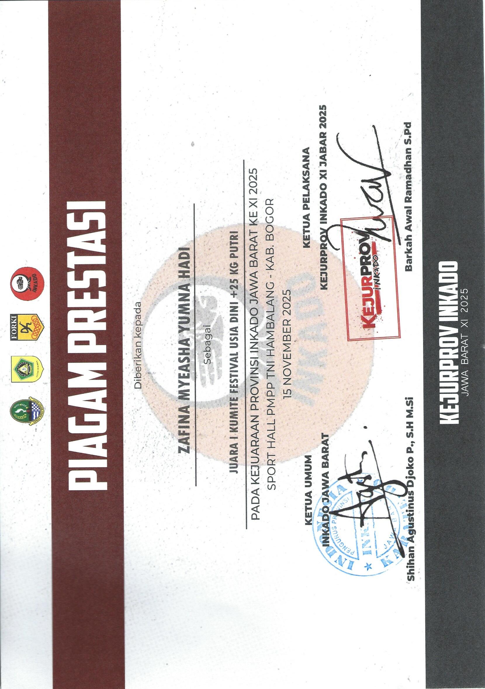 Pada tanggal 15 November 2025 Ananda Zafina Myeasha Yumna Hadi telah mengikuti lomba KEJURPROV INKADO yang diselenggarakan oleh INKADO Jawa BArat ditingkat Provinsi . Alhamdulillah Ananda meraih juara 1 Kumite Usia dini +25 kg Putri.