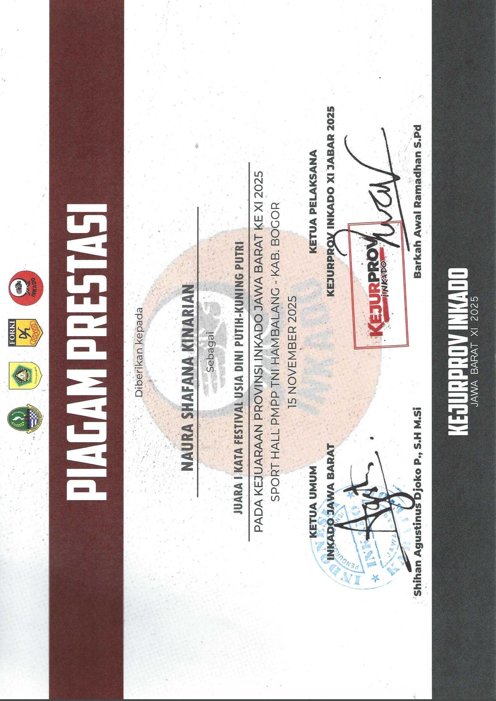 Pada tanggal 15 November 2025 Ananda Naura Shafana Kinarian telah mengikuti lomba KEJURPROV INKADO yang diselenggarakan oleh INKADO Jawa BArat ditingkat Provinsi . Alhamdulillah Ananda meraih juara 1 Kata Kumite Usia dini Putih-Kuning Putri.