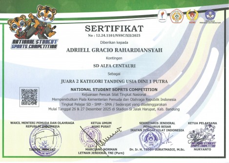 Pada tanggal 27 Desember 2025 Ananda Adriell Gracio Rahardiansyah telah mengikuti lomba National Student Sport Competition yang diselenggarakan oleh KEMENPORA ditingkat Nasional . Alhamdulillah Ananda meraih juara 2 Kategori Tanding Usia Dini 1 Putra.