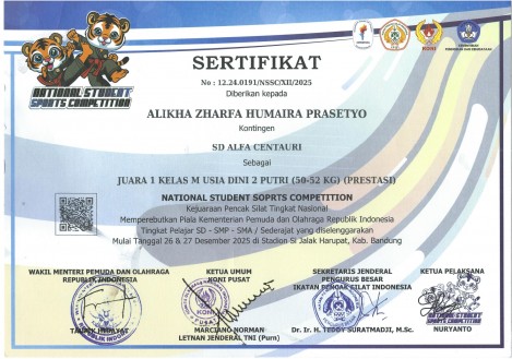 Pada tanggal 27 Desember 2025 Ananda Alikha Zharfa Humaira Prasetyo telah mengikuti lomba National Student Sport Competition yang diselenggarakan oleh KEMENPORA ditingkat Nasional . Alhamdulillah Ananda meraih juara 1 Kelas M Usia Dini 2 Putri (50-52 KG) (Prestasi).