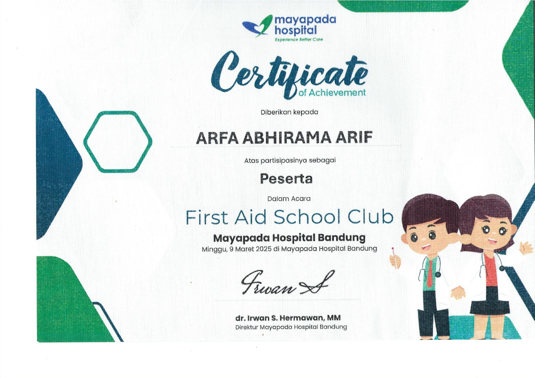 Pada tanggal 09 Maret 2025 Ananda Arfa Abhirama Arif telah mengikuti lomba First Aid School Club yang diselenggarakan oleh Mayapada Hospital ditingkat Sekolah . Alhamdulillah Ananda meraih juara 3.