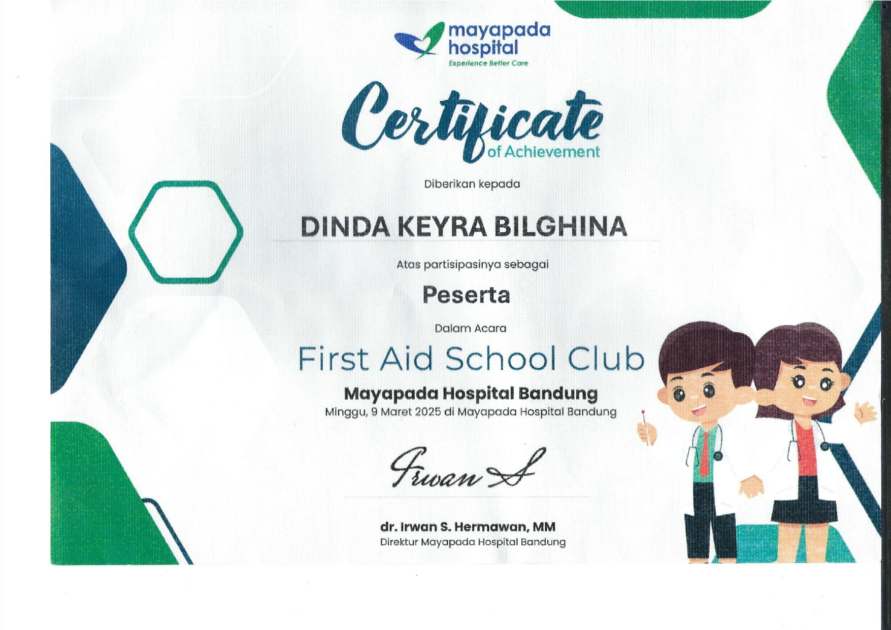 Pada tanggal 09 Maret 2025 Ananda Dinda Keyra Bilghina telah mengikuti lomba First Aid School Club yang diselenggarakan oleh Mayapada Hospital ditingkat Sekolah . Alhamdulillah Ananda meraih juara 3.