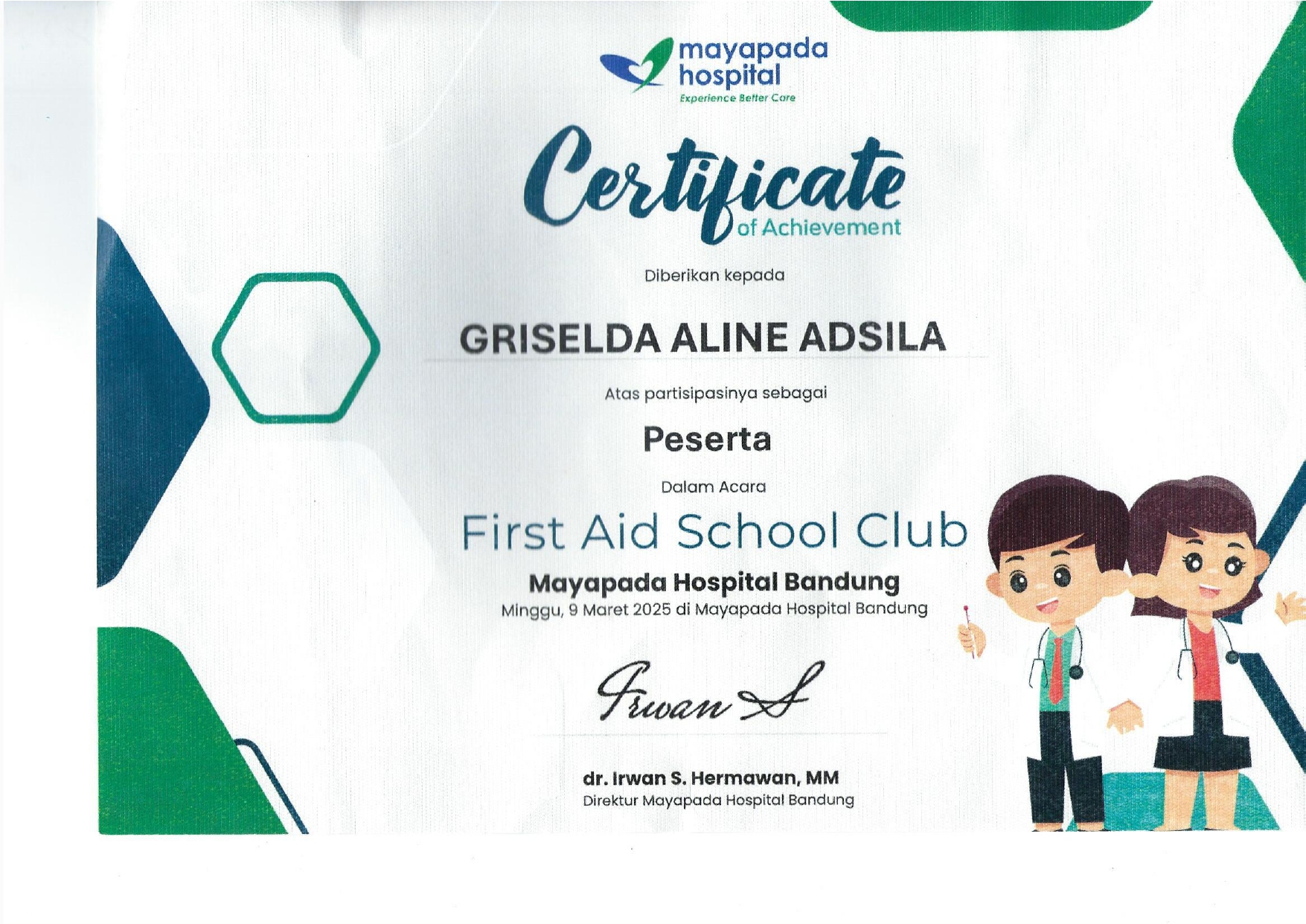 Pada tanggal 09 Maret 2025 Ananda Griselda Aline Adsila telah mengikuti lomba First Aid School Club yang diselenggarakan oleh Mayapada Hospital ditingkat Sekolah . Alhamdulillah Ananda meraih juara 3.
