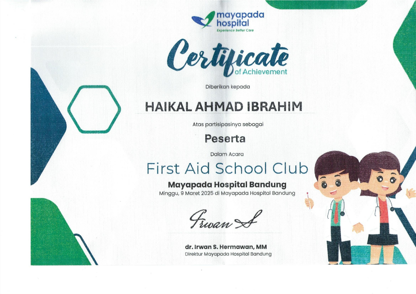 Pada tanggal 09 Maret 2025 Ananda Haikal Ahmad Ibrahim telah mengikuti lomba First Aid School Club yang diselenggarakan oleh Mayapada Hospital ditingkat Sekolah . Alhamdulillah Ananda meraih juara 3.
