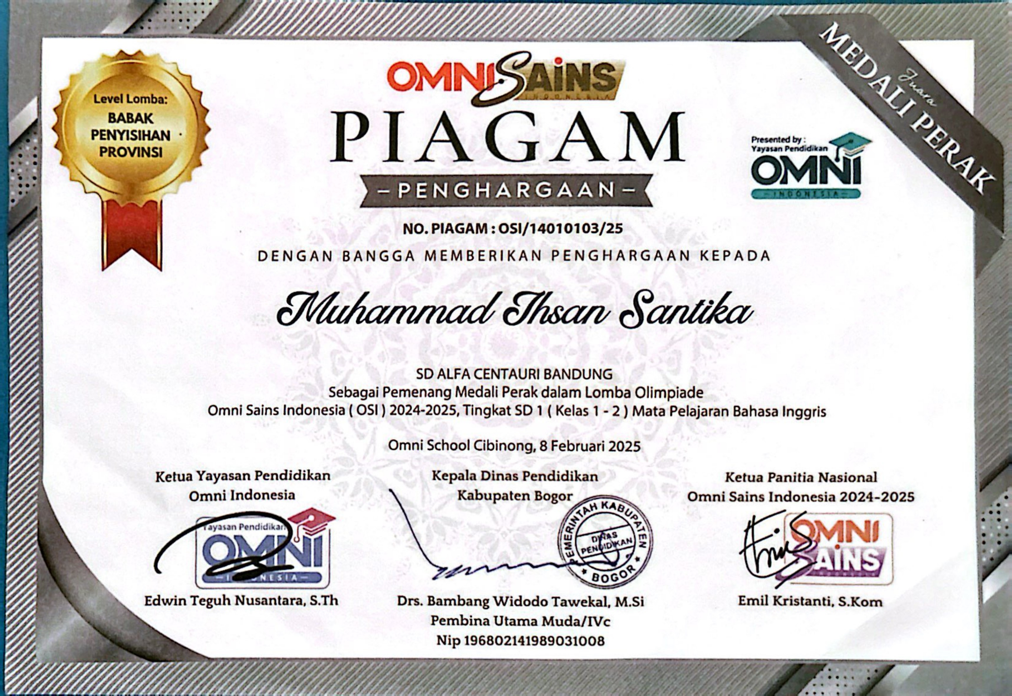 Pada tanggal 08 Februari 2025 Ananda Muhammad Ihsan Santika telah mengikuti lomba Olimpiade Omni Sains (OSI) yang diselenggarakan oleh Yayasan Pendidikan Omni School ditingkat Nasional . Alhamdulillah Ananda meraih juara 3.
