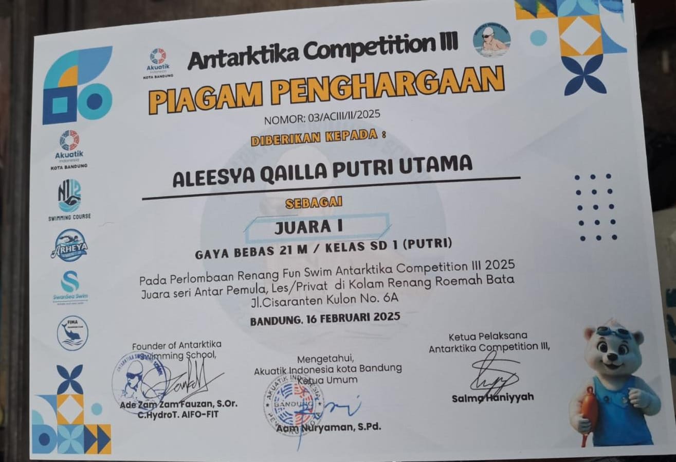Pada tanggal 16 Februari 2025 Ananda Aleesya Qailla Putri Utama telah mengikuti lomba Seri gaya bebas 21 meter yang diselenggarakan oleh Antarktika Competition III ditingkat Sekolah . Alhamdulillah Ananda meraih juara 1.