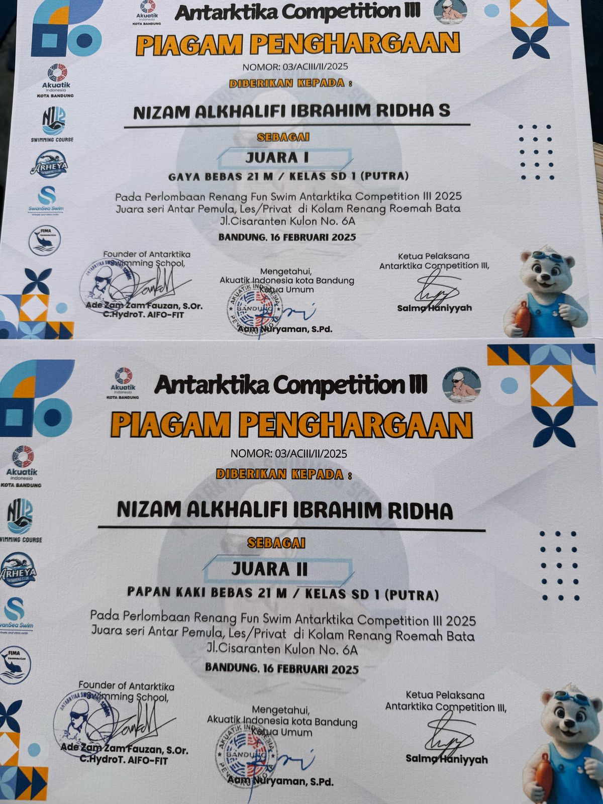 Pada tanggal 16 Februari 2025 Ananda Nizam Alkhalifi Ibrahim Ridha telah mengikuti lomba Seri gaya bebas 21 meter yang diselenggarakan oleh Antarktika Competition III ditingkat Sekolah . Alhamdulillah Ananda meraih juara 1.