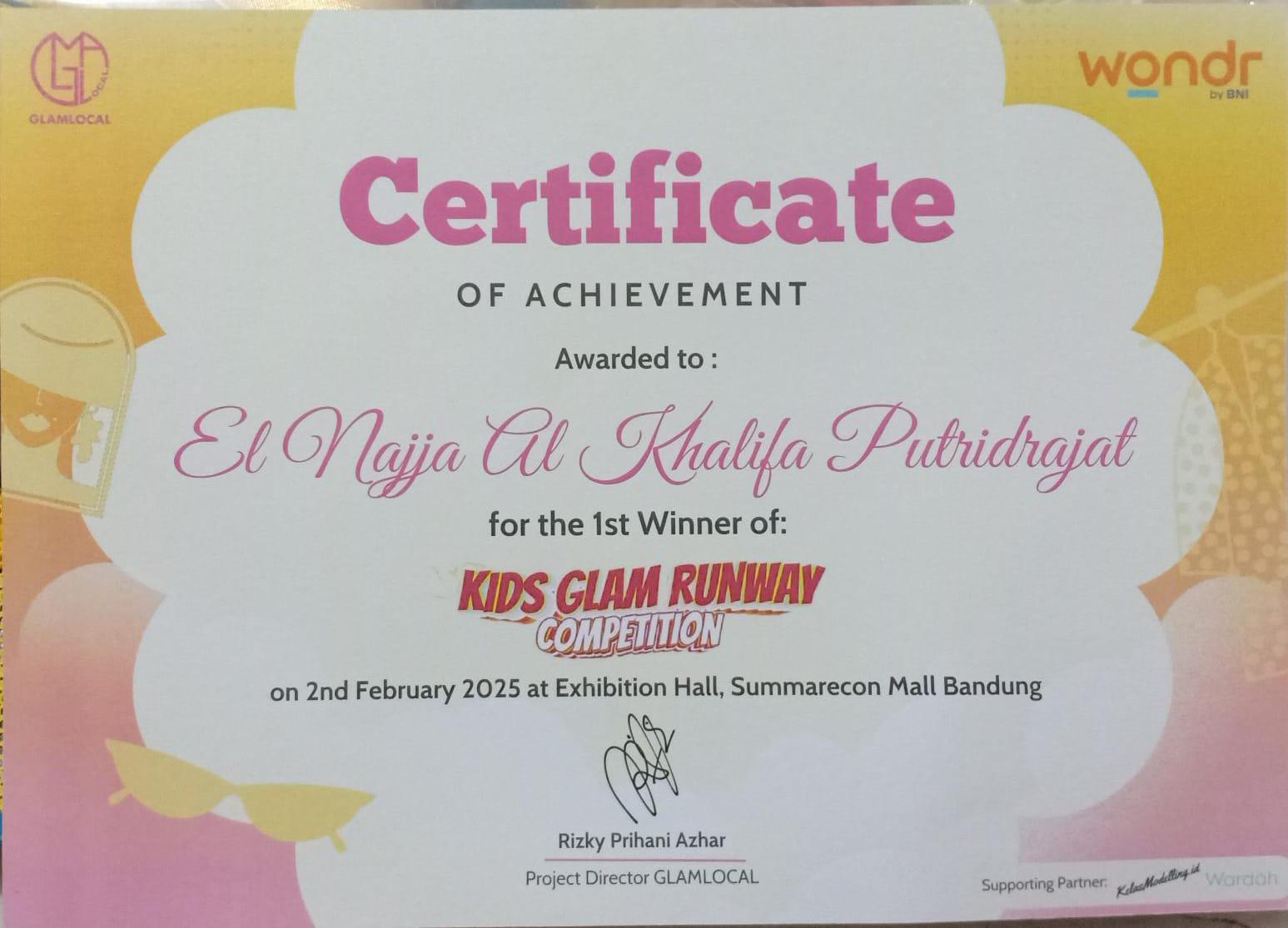 Pada tanggal 02 Februari 2025 Ananda El Najja Al Khalifa Putridrajat telah mengikuti lomba Lomba Fashion show yang diselenggarakan oleh Glam Local ditingkat Kotamadya . Alhamdulillah Ananda meraih juara 1.